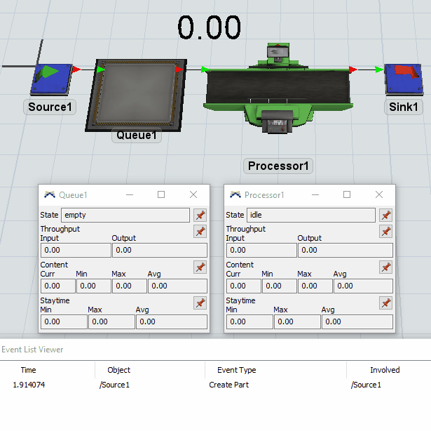 In the previous example, you can see values that change between events; flowitems travel smoothly across the processor, and the average content statistic changes frequently. This may seem to go against the nature of event-based simulation.