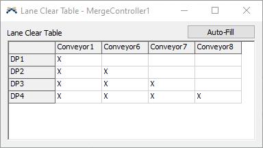 The Lane Clear Table prevents merge jams and shortens the gaps between slug releases. The rows and columns are automatically be generated based on the objects the merge controller is connected to, but you can edit the table to change the order in which rows and columns are listed. The X's in the columns define which decision point (or other conveyor logic) needs to be cleared before the merge controller can release a slug from a particular lane.