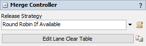 The merge controller object can be used to reduce the gaps and prevent collisions between slugs as they move onto the merging conveyor. Its logic is defined by its two main properties: 1) Release Strategy, and 2) the Lane Clear Table. These two properties determine how it will prioritize merging lanes.