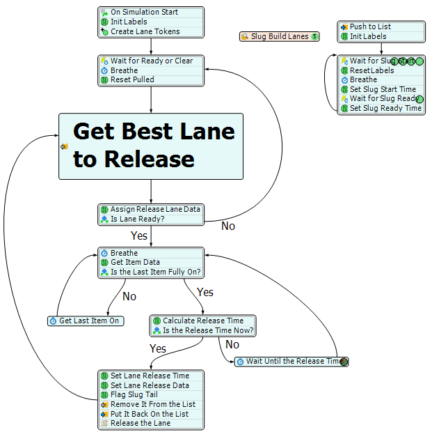You can use a template Process Flow to create logic that will close the gaps in between slugs even more. The following image is an example of a merging conveyor system that uses process flow to determine the ideal release rate: