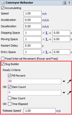 For example, in the following image, each conveyor in this system is set to build a slug of at least four items before it can be released: