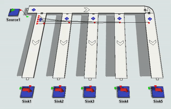 For example, in the conveyor system shown in the following image, flow items are sent to the conveyor that matches the number in the type label on the flow item. There are five different flow item types (each with a different color). The On Arrival trigger for the first decision point is assigned the Send Item picklist behavior. The Destination property is will evaluate the type label on the item and send it to the output port that matches that number.