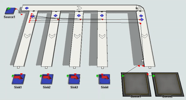You can also create port connections between decision points, photo eyes, and stations so that they can reference each other, possibly sending flow items or information to each other.