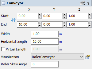 A conveyor's length is based on the position of the start relative to the end. For example, if a conveyor is parallel with the X-axis on the grid with its start at the 0.0 position and the end is in the 10.0 position, the conveyor will be 10 units long. The same is true for the other axes. Experiment with some of the Properties to get your conveyor exactly the way it should be.