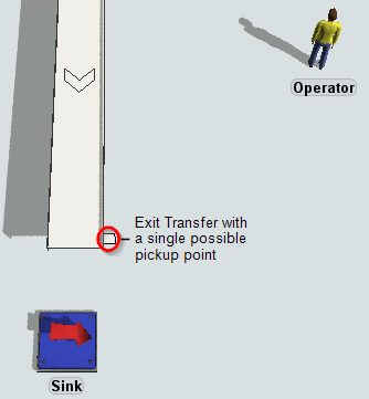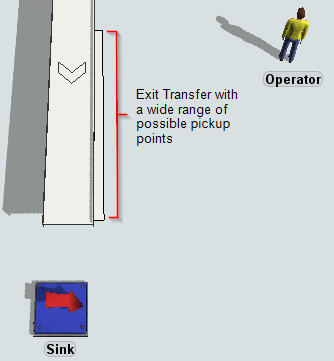 | Exit Transfers | Exit transfers are connections from a conveyor to a non-conveyor object (such as a sink or other fixed resource). Exit transfers have the ability to send for a transport (a task executer) to pick up items and deliver them to another object. Task executers can pick up items from a particular point on the exit transfer or a range of possible points along an exit transfer. | ![]() |