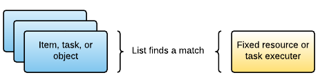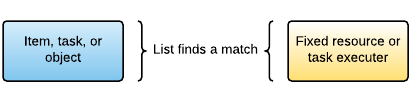Eventually, another object (such as a downstream fixed resource or a task executer) will attempt to pull an item/task/object from the list. This object might have additional criteria or restrictions about which type of item/task/object it needs. The list will determine which list entry is the best match for the fixed resource or task executer. When it finds a match, the fixed resource or task executer will pull the matching item/task/object from the list.