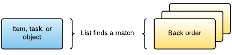 In a similar vein, a fixed resource or task executer might attempt to pull from a list at a moment in time when there aren't any matching item/tasks/objects on the list. When that happens, the list will create a back order. A back order is an open request for a list entry that needs to be filled. When a new item/task/object is pushed on the list, the list will evaluate it to see whether it can fulfill any back orders.