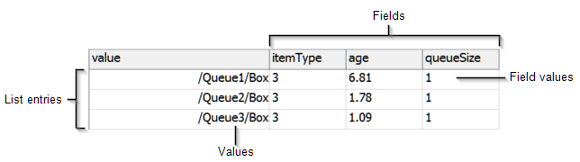 The field values display the current data for each field for a given list entry at a given point in time. In the example in the previous image, the age fields show the amount of simulation time units that the boxes have been on the list. According to this list, the box in the first queue has been waiting the longest, for 6.81 time units.