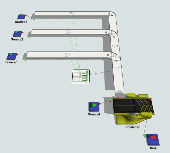 For example, in the following image, three sources create flow items and transfer those items to conveyors. Then the combiner receives the flow items and packs them into a tote. In that sense, the three sources could be said to be upstream, while the combiner could be said to be downstream:
