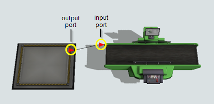 Input/output ports are the most common types of port connections. These ports are usually used to connect two fixed resources together so that they can exchange flow items. The output port of an upstream object is connected to the input port of a downstream object. An output port is where the flow item exits the object and an input port is where the flow item enters the object.