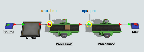 Another important concept you should understand about ports is how to know when a port is open or closed and why. Simply put, an open port is ready to push or pull flow items. A closed port is not ready to push or pull flow items. During a simulation run, open ports are green and red ports are closed: