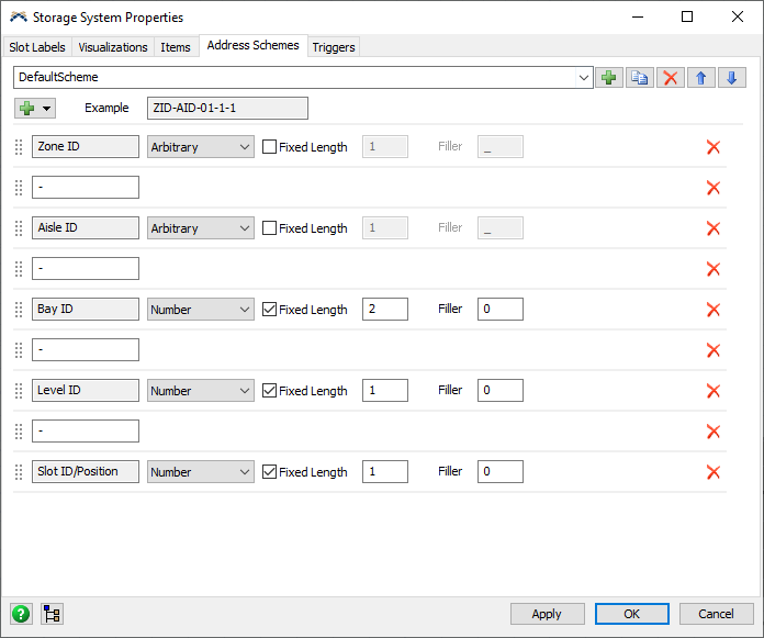 Here in the Address Schemes tab you will find multiple fields to help create and maintain multiple Addressing Schemes for your project. The top field displays the currently selected theme, and next to the field are multiple buttons for creating, copying, deleting, and reordering the Address Schemes. Generally speaking, a warehouse will only use a single addressing scheme. However, you can create as many Address Schemes as your model logic needs. This may be useful if, for example, you want to simulate a facility that has multiple separate buildings that each use completely different addressing schemes.