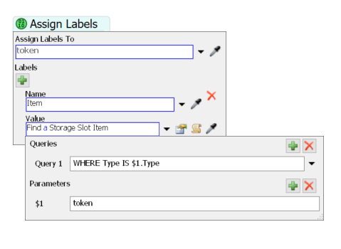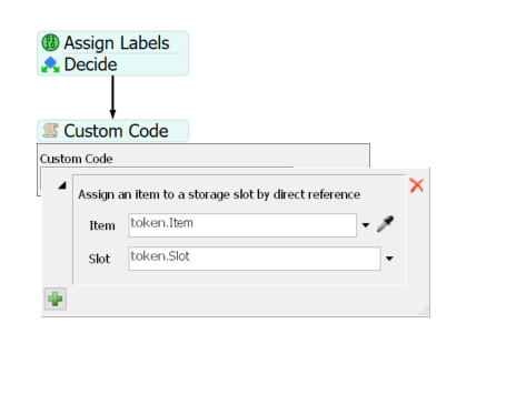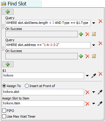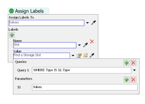 This query will return a Storage Slot where the Type label of the Slot matches the Type label on the token. As documented previously, you could then use a Decide activity to determine whether a slot was retrieved, and a Custom Code activity to assign the retrieved slot to the item.