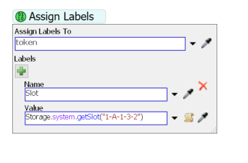 Using an Assign Labels activity we can assign a label to a token. selecting from the picklist options on the value of the label, we can select the Get a Storage Slot by Address selection from the Warehousing menu. You will notice that the value field of the label now has the getSlot() command. It will by default enter a filler label as the parameter value; you can enter your address string or a label with the address string as the parameter value.
