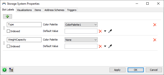 Another way of assigning slots and slot values, is to use labels. In the Storage System object’s properties, you can click on the first tab named Slot Labels. This window will be blank by default, but by clicking on the green "+" sign you can add a label for all the slots in your Storage System. This would be a good way to attach a Type label to the slots, for example. Once a new label is created here, you will notice several fields that give you options for the newly created label. The first field is the name of the label, then you can select a Color Palette from your s election of Color Palettes in your model (See the Color Palette reference documentation for more information). The Indexed checkbox will allow you to select whether the label is indexed or not. (See the Slot Labels reference documentation for more information about indexing.) Finally, the last field will let you determine if the label has a Default Value.