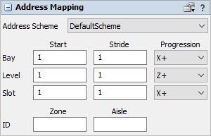 In the Address Mapping section, you can change how the rack will count its Bay and Levels, as well as the Rack to an Addressing Scheme. This document will go into more detail about Address Schemes later on. For more detailed information on setting Bay and Level Progression and Stride, please see the reference documentation on the Storage Object.