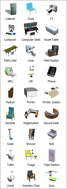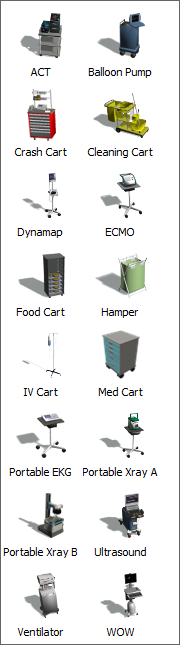 The 3D objects in the FlexSim Healthcare Library are the basic building blocks you will use to build your 3D model. Each object has built-in logic that is commonly used in a variety of healthcare simulation models. You can also easily edit the properties and customize the logic on these objects to adapt any of them to the unique needs of your simulation project. The following sections will provide a high-level overview of the types of Healthcare objects in the Library. Each object has a link to its object reference page for more information. The categories and objects are presented in the same order as they appear in the Library.