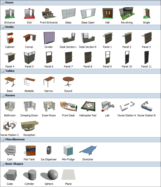• Healthcare 3D objects are automatically added to groups based on the types of objects they are. When you add a Healthcare object to a 3D model, it is automatically added to the general location, staff, transport, or equipment group depending on what type of object it is. (The exception to this rule are props and visual objects, such as entrances and exits, which have a purely visual function within the model.) In order to make your model's logic scale better, you should consider creating sub-groups for the objects you add to your model. See Using Groups as a Best Practice for more information.