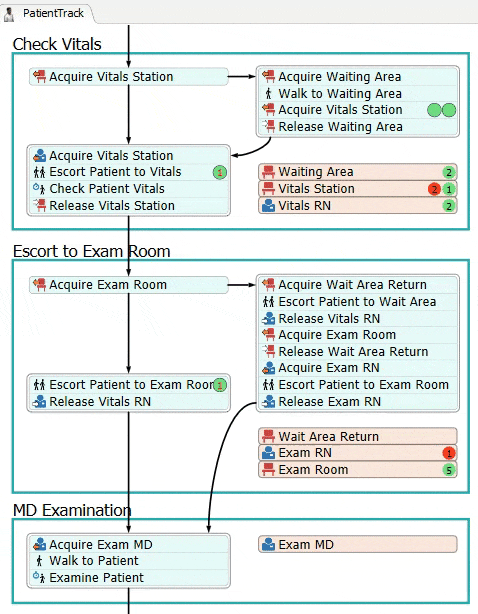 You can use the patient flow features in the Process Flow tool to create plans for patients to follow based on the patient's acuity, diagnosis, or any other criteria you determine. These plans can include different activities or processes that should occur from the moment a patient arrives to the time they depart. These patient flows can also pull the necessary human resources to provide patient care and guide them to the appropriate next step in their treatment.