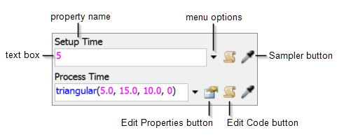 A typical property in FlexSim will usually have similar components. The following image labels these components for two different properties on a processor: