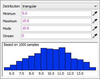 contrast, the process time is set to triangular(5.0, 15.0, 10.0, 0). This means