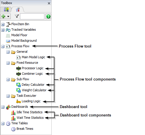 The Toolbox provides a single place where you can see all of the tools and tool components you are using in your simulation model. You can also use the toolbox to manage tool components. (See What Are Tool Components? for more information.)