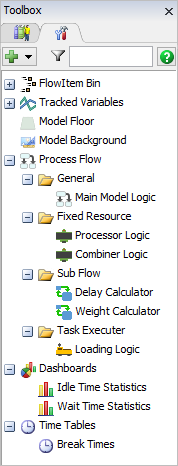 The Toolbox is the place you can go to access nearly every tool in FlexSim. (See Overview of Tools for a brief description of all the tools that are available in the Toolbox.)