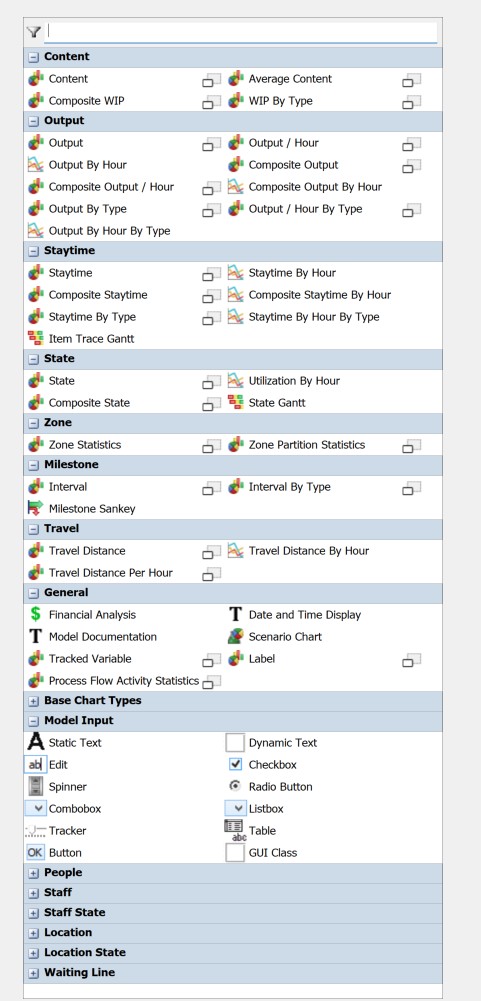 FlexSim provides many easy-to-use chart options in the Dashboard Library. For the most part, these charts are organized by the kind of statistic they display. For example, to view Output data for an object, or for several objects, consider choosing a chart from the Output section.