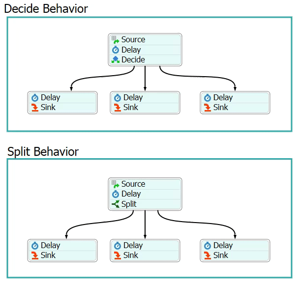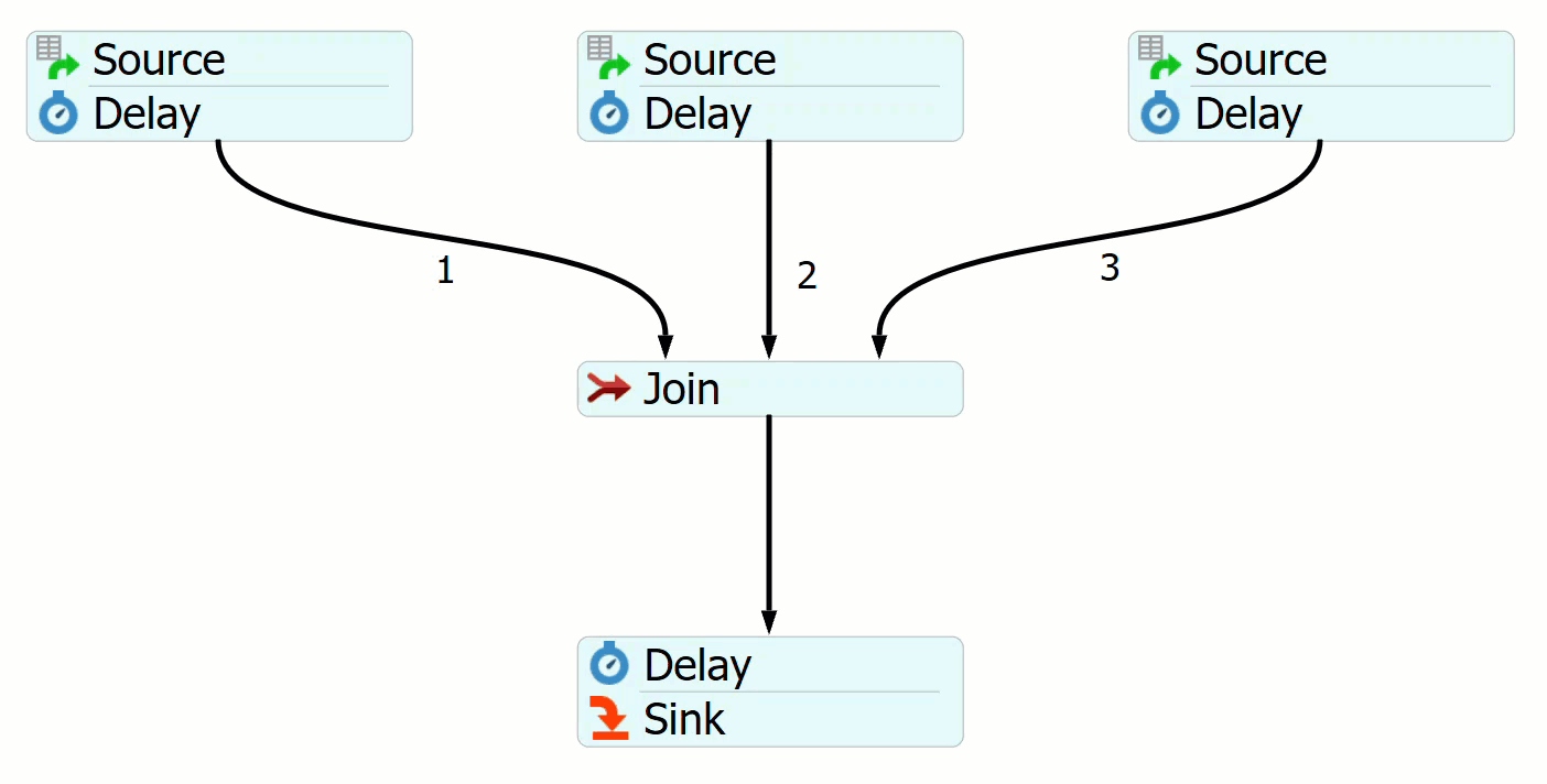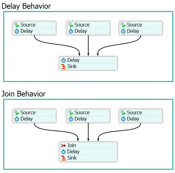 When a token enters most process flow activities, it doesn't matter at all which incoming connector it used to enter the activity. For example, a Delay activity will treat all incoming tokens the same. No matter which connector the token came from, the Delay activity will apply the same Delay time or statistical distribution for each entering token. In contrast, the Join activity will wait until a token has entered from each incoming connector before it releases a token. In other words, the amount of time an arriving token waits at the Join activity is determined by: