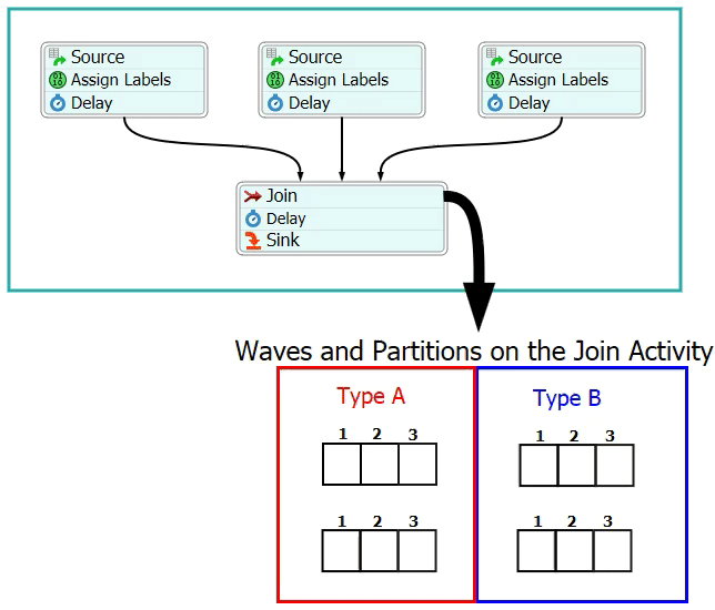 The Join and Synchronize activities can also create waves with tokens that share a common attribute using a partition ID. A partition ID is defined by a label on the incoming tokens and it can be a number, string, array, or reference to an object or node. The Join and Synchronize activities can sort incoming tokens into waves based on data from a label on the tokens.
