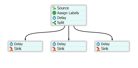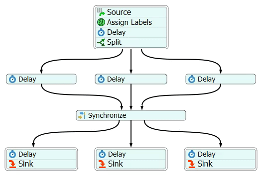 For example, the following image simulates a system with two different product types: A and B. Each incoming token has a label named productType. The Assign Labels activity assigns a value of either "A" or "B". When the tokens enter the Join activity, it assigns them to waves based on 1) which connector it came through, and 2) its partition ID (based on the productType label). It will release a wave after it has a token from each connector with matching partition IDs: