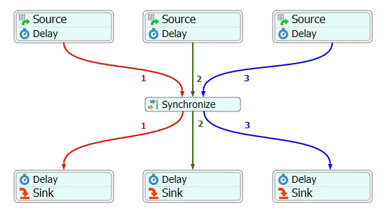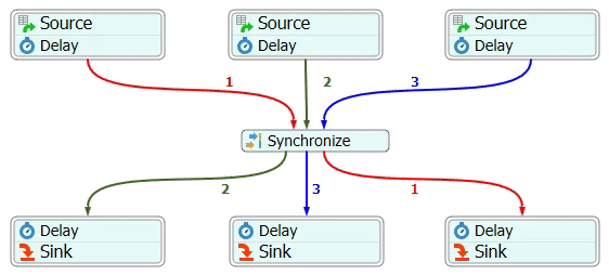 The Synchronize activity waits until it has a token from each of its incoming connectors, then it releases all the tokens at the same time. The Synchronize activity is similar to the Join activity, but rather than releasing only one token, it releases all the tokens simultaneously.