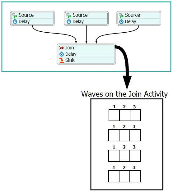 If Join or Synchronize activities receive more than one token through one incoming connector, it will create additional waves. The following image visualizes what happens inside a Join activity as it receives tokens and creates waves: