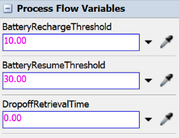 For example, imagine you wanted to use the AGV template process flow to control a simulation model that uses automatic guided vehicles (AGVs). Different brands or models of AGVs might have varying battery lifespans. The time they take to drop off or retrieve flow items might depend on factors that are unique to a specific model. For that reason, the AGV template provides three different process flow variables to easily control these settings for all AGVs that are connected to the process flow: