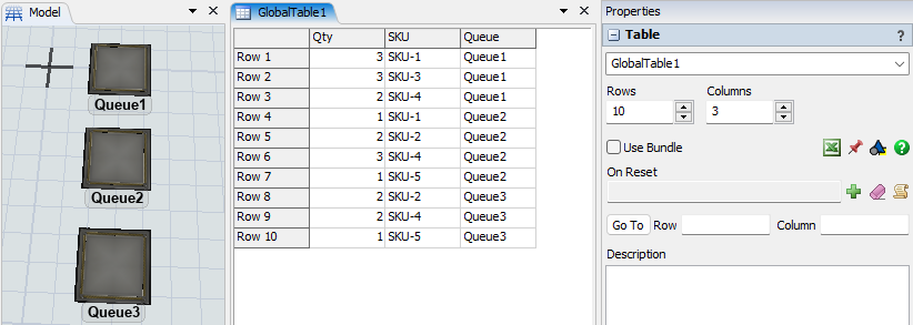 When you reset and run the model, flowitems will be created in each queue with the correct SKU label as specified by the Global Table. Try changing values in the table and then resetting and running the model again.