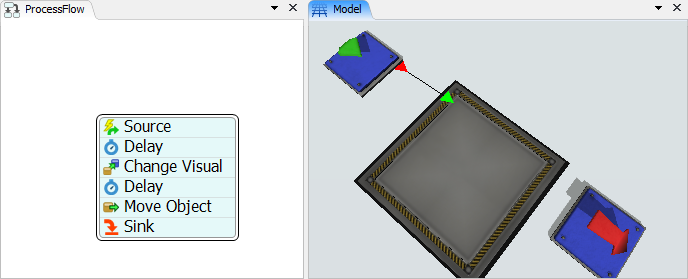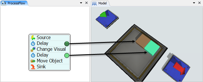 One of the most important purposes of labels is to link a token in a process flow to an object in a 3D model (such as a flow item, a task executer, or fixed resource). Process flows can control the logic of the 3D model using labels that contain a reference to a 3D object in the model. As the token moves through the activities in the process flow, the activity's logic can be applied to the object in the 3D model.