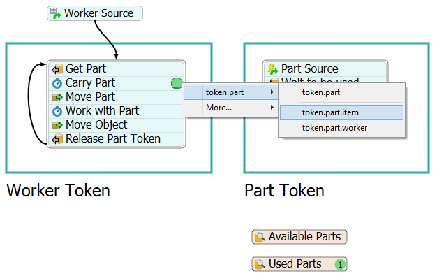 Labels can be used to store references to other objects. This is how you can connect tokens with flow items or with other tokens. For example, suppose you wanted to change the color of flow items on a queue using a Process Flow. You might make a model like the following: