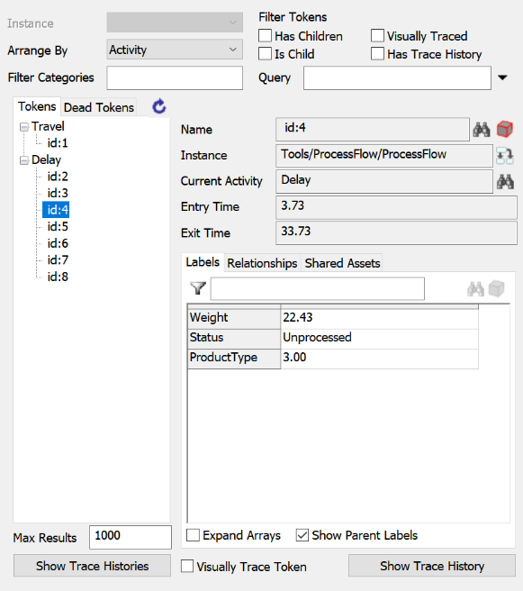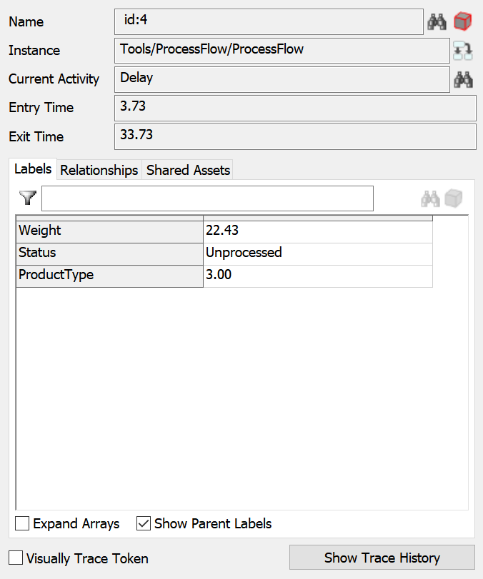 During a simulation run, you can double-click a token in a process flow to view its properties window. Its Labels tab will display the current values of the labels on the token: