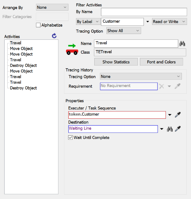 The View Activities tool can search for all process flow activities that use a particular label. This tool can help you get an overall perspective on how a label is being used throughout an entire process flow. You can also edit an activity's properties directly in this window.