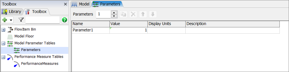 All model parameters are defined in Model Parameter Tables. By default, new models have a single parameter table called Parameters. You can find it in the toolbox: