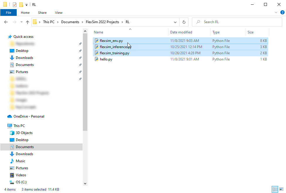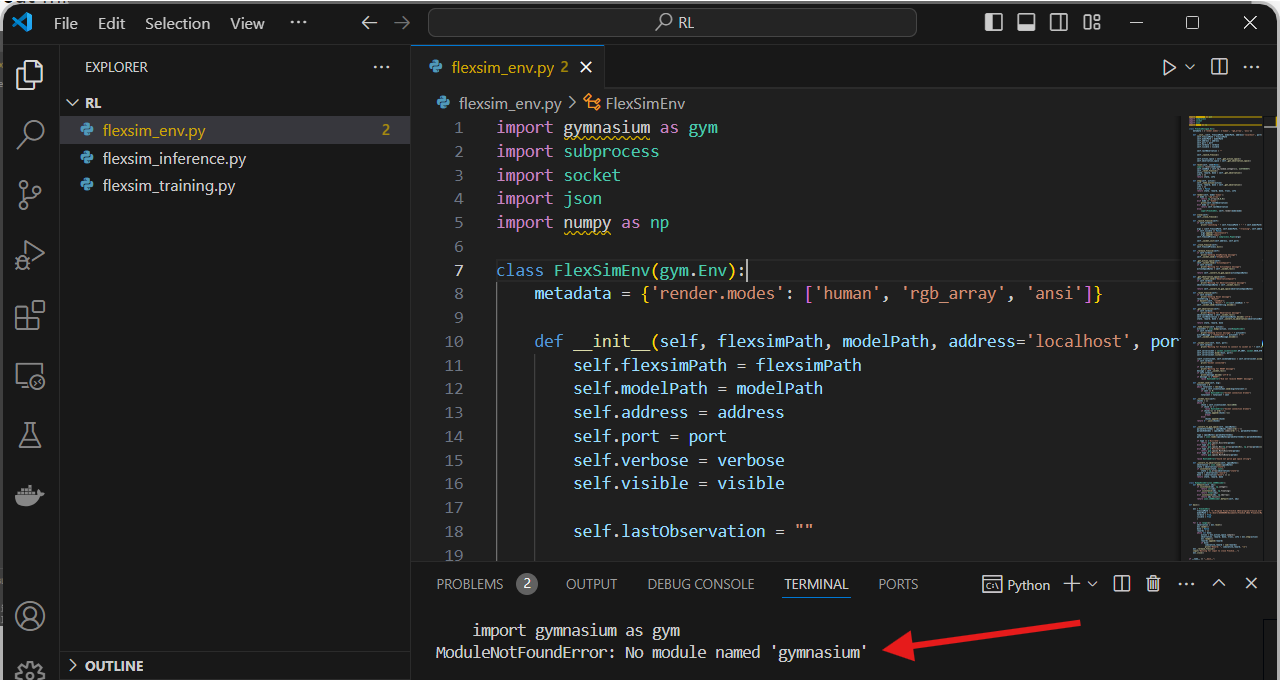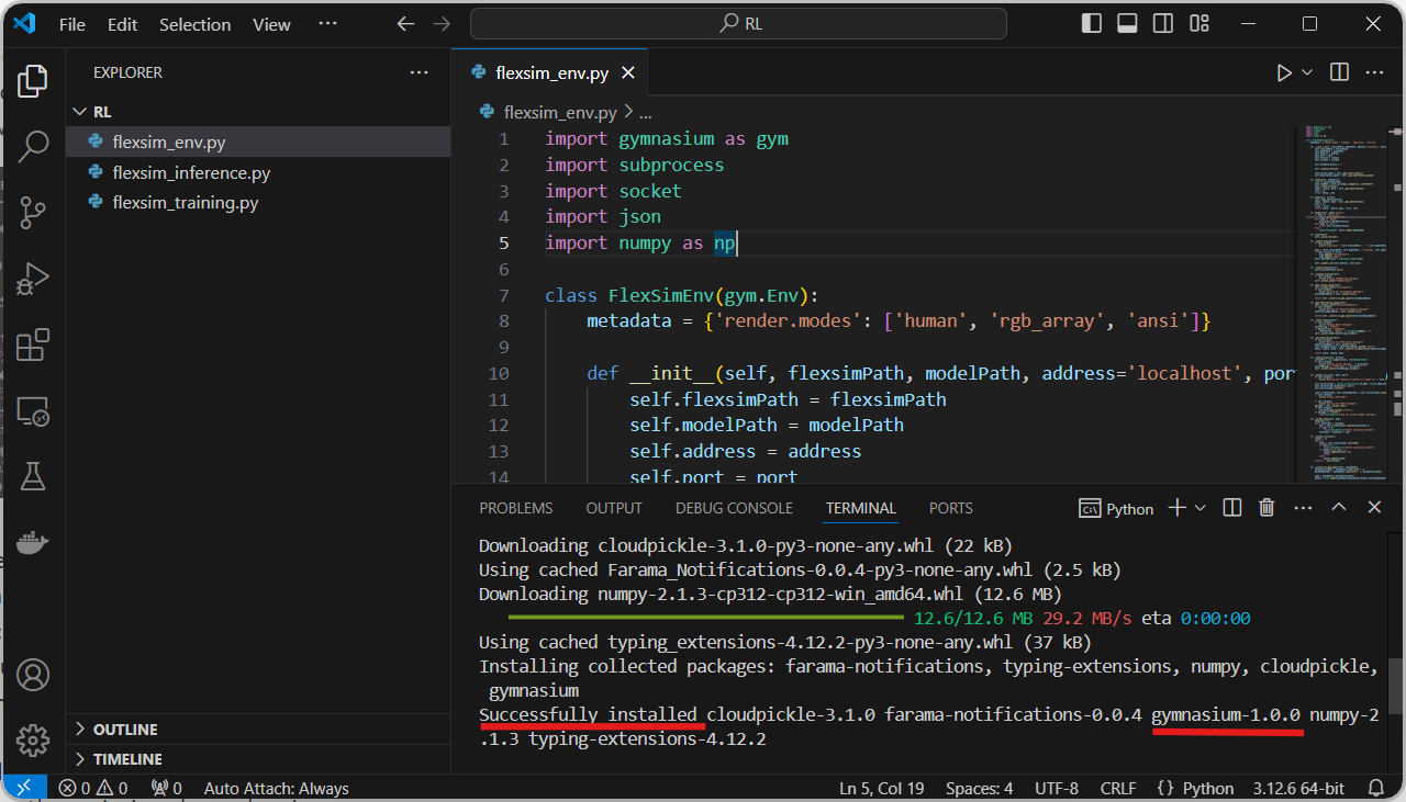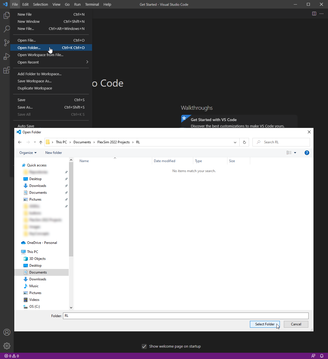 - Create a folder for RL Python development (such as Documents/FlexSim 2022 Projects/RL) and open it with VS Code.
