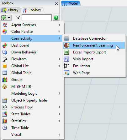 1. In the Toolbox pane, add a Connectivity > Reinforcement Learning tool.
