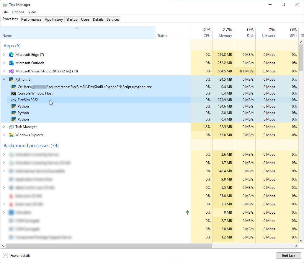 7. In this script, because visible is set to False on the FlexSimEnv, you will not see a FlexSim window appear. Instead, you can can use the Task Manager to see that a FlexSim process is created as a background process. The process may appear under a python process.