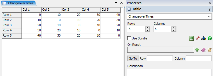 4. In the Global Table's Properties pane, change the name to ChangeoverTimes and set the number of rows and columns to 5.