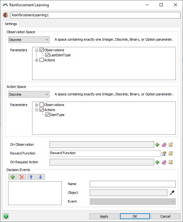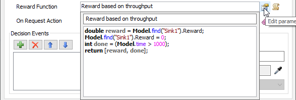 24. Back on the Reinforcement Learning properties window, edit the parameters for the Reward Function.