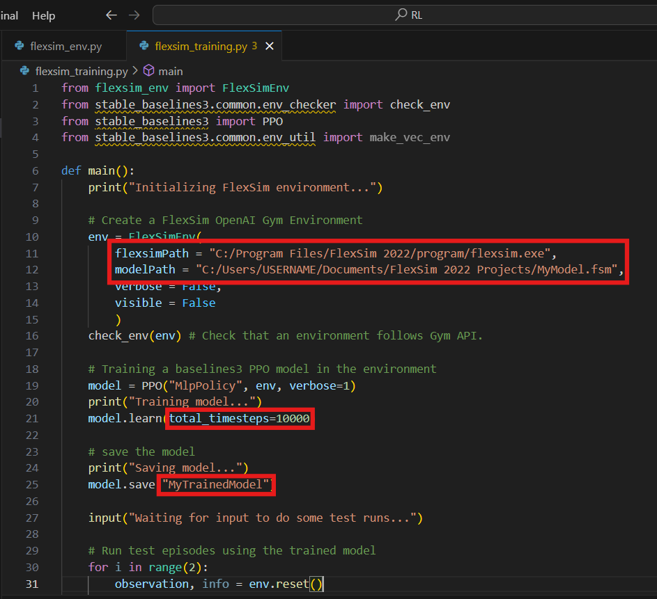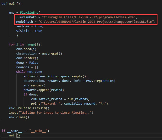 1. Near the bottom of the flexsim_env.py script, modify the flexsimPath and modelPath to reference the location where FlexSim is installed and where the model is saved. For example: