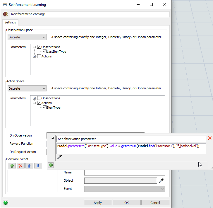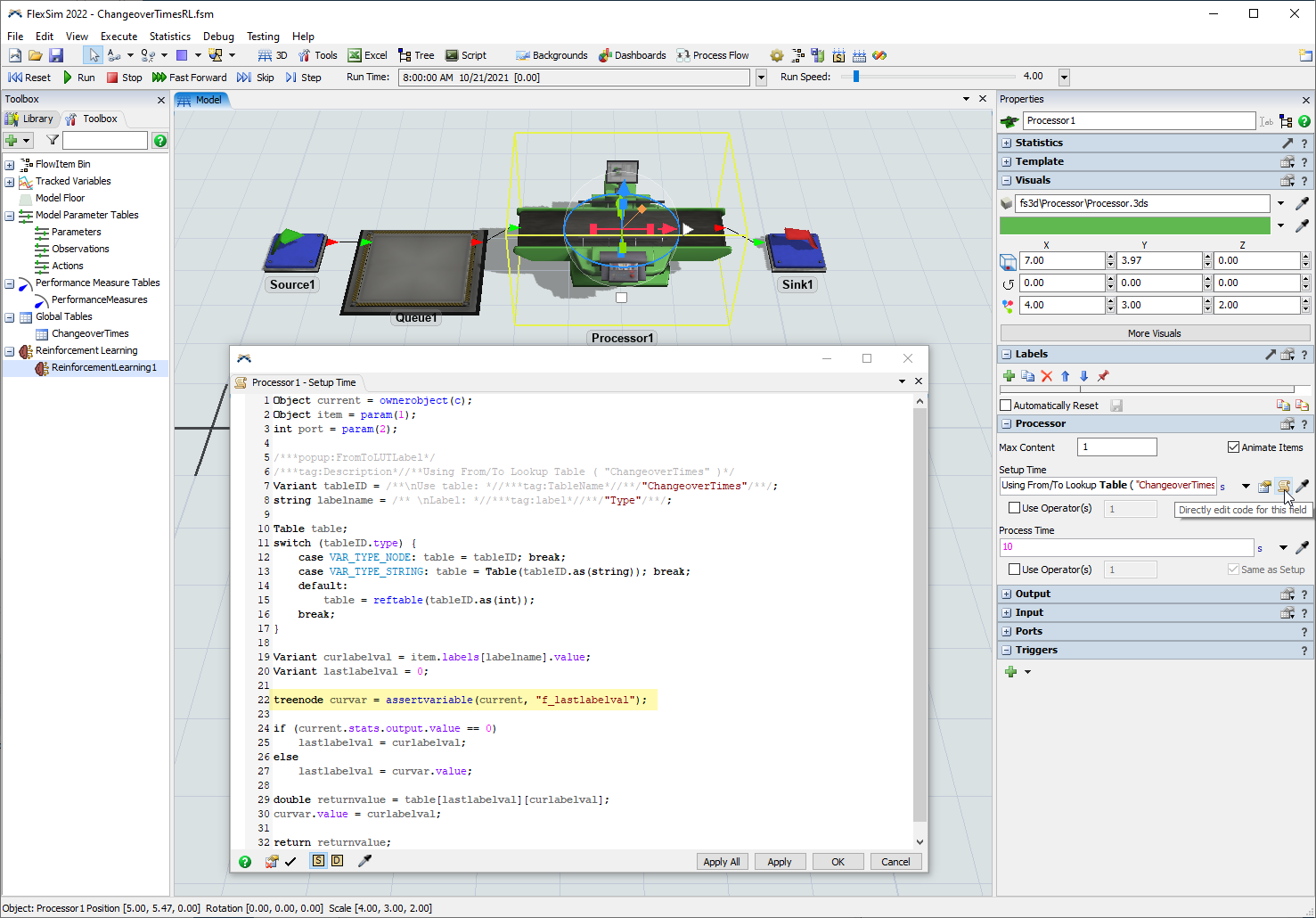 7. If you click on the processor and press the Code button on its Setup Time picklist, you can see that the code sets a variable named "f_lastlabelval". We will use this variable to set the LastItemType observation parameter from within the On Observation callback of the Reinforcement Learning tool.