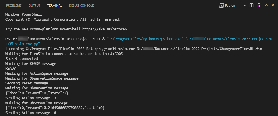 The environment also has two parameters address and port that control the socket connection to FlexSim. By default, it uses 'localhost' on port 5005, but you can override those values when you create an instance of the FlexSimEnv class.