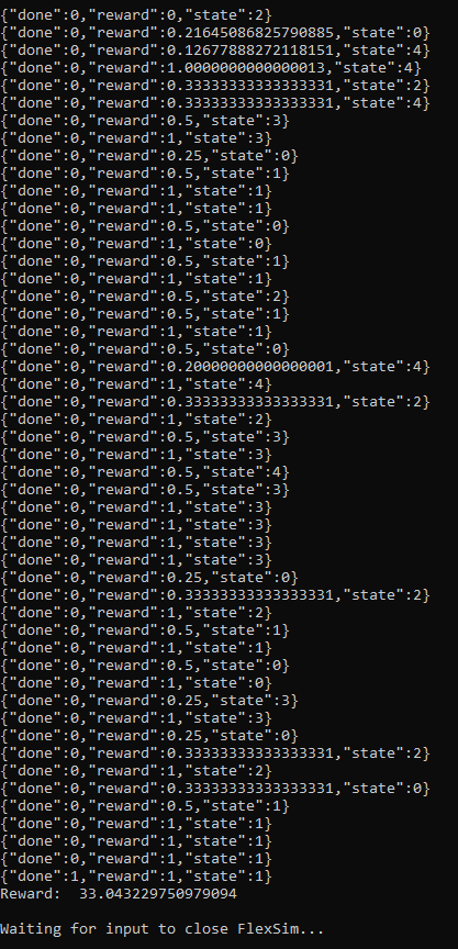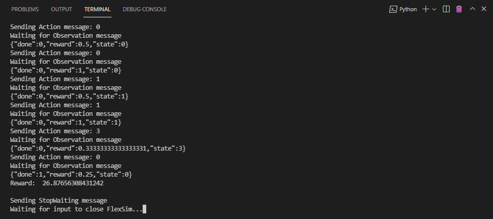5. In the python terminal window, press any key to close FlexSim and end the python process.