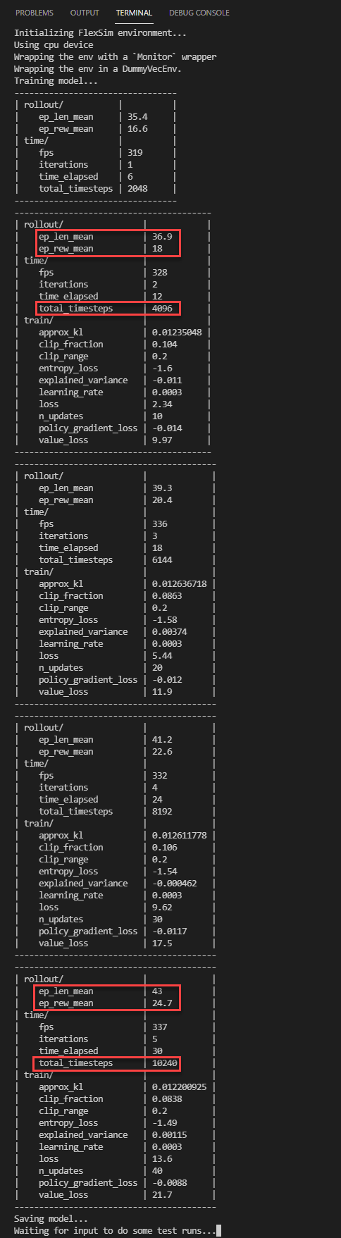 8. As the algorithm learns, Stable Baslines3 will print information to the python window about the training status.